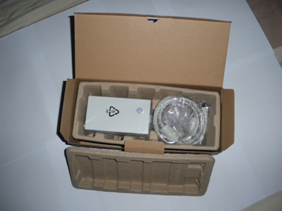 Contenu de la boîte : En ouvrant la boîte on découvre une nouvelle notice d’utilisation (page 1 et page 2). On constate ensuite que le boitier est plus mince (1/3 en moins environ par rapport à la version 1). Ce n’est pas la seule chose à avoir aminci puisque le câble reliant la Freebox au Freeplug est réduit de moitié (90 cm environ pour cette nouvelle version).
