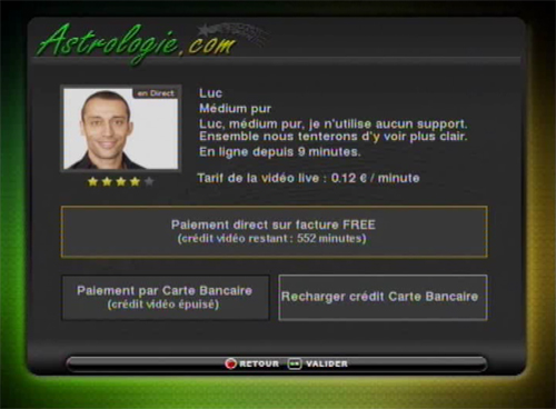 Ca me fais rire, y'a des astrologues et des voyants sur plein de radios, dans les magazines et même à la télé et là y'en a qui diabolisent Free par ce qu'il propose de la voyance. France 2 diffuse aussi le Jour du Seigneur, personne n'est obligé d'y croire il me semble, et pourtant faire passer une telle croyance sur une grande chaine nationale a beaucoup plus d'impact chez les gens. Donc bon, laissez les gens libres de croire ce qu'il veulent, on n'a pas à juger.