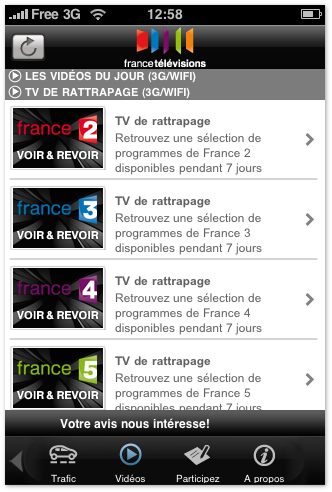 Après BFM TV, France24, Canal+ et bien d’autres, FranceTélévisions propose désormais une application pour iPhone ou Ipod Touch permettant de suivre toute l’actualité et les programmes proposés par le groupe. L’application « France TV » se divise en plusieurs sections :