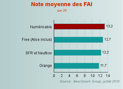 C'est quoi ce classement ? Aucune explication sur la méthode utilisée pour constituer le panel ni sur la méthode pour interroger les internautes. Le fait que Numéricable sorte en tête est bien la preuve de l'absence de sérieux de ce sondage. Le vrai seul sondage, c'est comme pour les élections, c'est le nombre d'abonnements et là pas de pb c'est SFR qui est en tête trés trés largement.