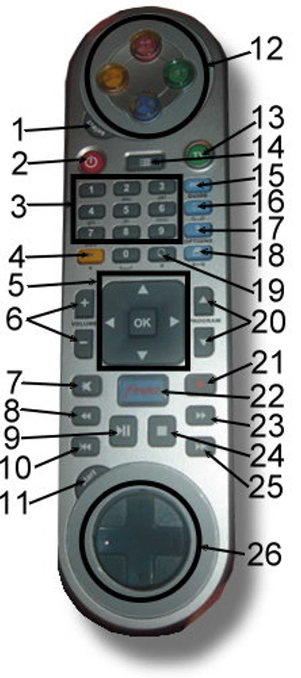 On remarquera ainsi la touche l’apparition de la touche "Va et vient chaine" qui permet de retourner rapidement sur la chaine précédement regardée. Une touche très utile qui fut demandée à plusieurs reprise par les freenautes. Les touches * et # sont, en revanche, absentes sur cette télécommande. Esperons que nous pourrons tout de même avoir accès aux informations qu’elles nous donnaient ... (surtout la touche *)