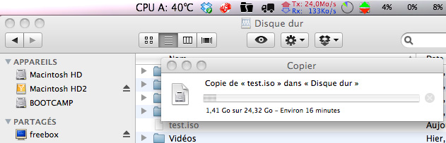 Maj : Il semble que cette brève provoque un débat d’expert. Celle-ci n’a que pour but de montrer quel débit on peut avoir en usage courant. (Madame tout le monde, en wifi ou en utilisant le câble Ethernet donné par Free - si ce dernier est en Gb-). Pour des tests plus poussés et précis, nous vous renvoyons aux tests du sites lesnumeriques.com