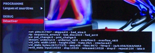 En ce qui concerne le mode debug de la Freebox V6, la première ligne concerne les paquets reçus. La seconde s’intéresse aux rtp : le Real-time Transfer Protocol qui a pour but principal d’offrir une connexion de bout-en-bout et en temps réel sur Internet. La troisième s’intéresse au monitoring TS, à la mesure des signaux Mpeg. Il s’agit des paramètres PAT (Program Association Tables) et des PMT (Program Map Tables). La PAT comprend une liste de tous les programmes contenus dans le TS, les PMT donnant les éléments associés à chaque programme.