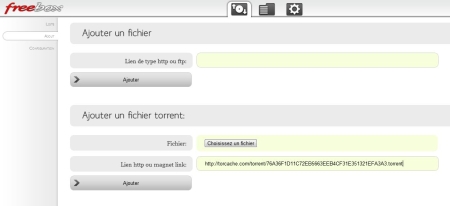 Voici l’écran le plus intéressant. Vous pouvez soit donner le lien vers un fichier en mode HTTP ou FTP. Des sites de partages de fichiers tels que MegaUpload ou MégaVideo proposent ce type de téléchargement. Rien de plus simple que de copier/coller le lien dans l’interface.
