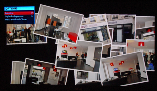 Pour visionner vos images présentes sur le server, il suffit de vous rendre sous la rubrique "photos". Deux diaporamas sont disponibles : le premier s’affiche en plein écran sur votre TV et le second est une succession d’images plus petites qui s’empilent sur votre écran. Pour utiliser la seconde, appuyez sur la touche verte de la télécommande. Une petite fenêtre d’options s’ouvre. Utilisez les flèches de la télécommande pour vous rendre dans "Style de diaporama" puis sélectionnez "Mini-Photos"