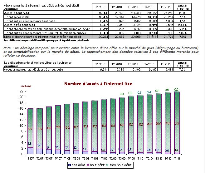 Selon l’Arcep, la France a dépassé le demi million d’abonnés au très haut débit fixe. On compte en France 516 000 abonnés au très haut débit en mars 2011, soit une hausse de 53,1% sur un an. Un chiffre à pondérer au 21,8 millions d’abonnés haut et très haut débit.