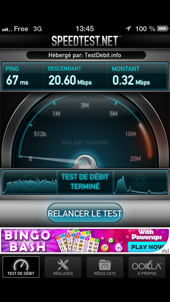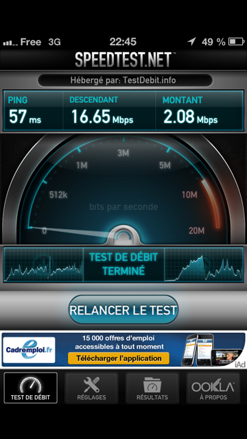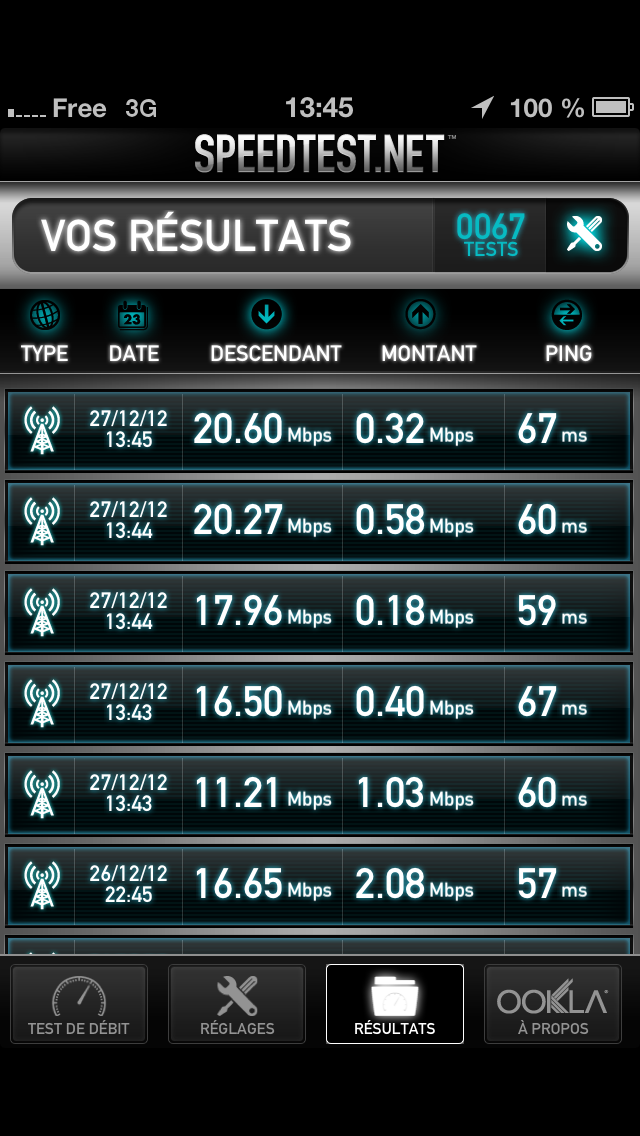 Free a installé 6 antennes à la Roche Sur Yon, en Vendée. Ca passe en H+ et voici le meilleur résultat obtenu avec un Galaxy S3 :