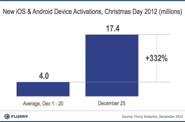 Selon une étude de Flurry, c’est 17,4 millions de Smartphones et Tablettes qui ont été activés à Noël. Par rapport à 2011 ou 6,8 millions d’activation avaient été enregistrés, presque 3 fois plus de terminaux. Le seul jour de Noël représente quatre fois plus d’activation que pour la période du 1 au 20 décembre. Un record qui fait le bonheur des fabricants et opérateurs télécoms.