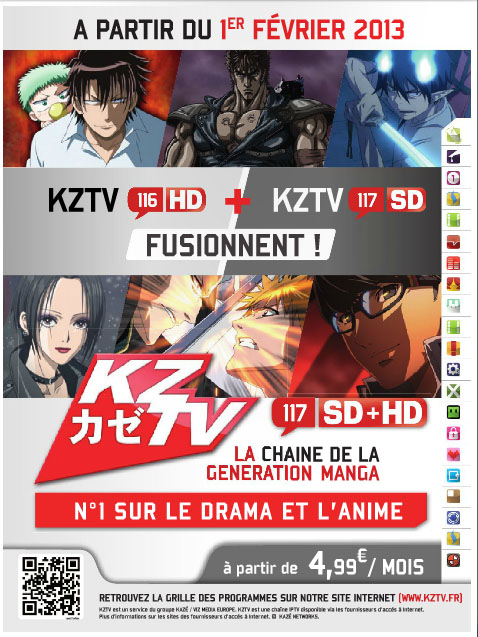 Le magazine Aktu Freebox de janvier annonce la fusion des chaînes KZTV et KZTV HD, qui se trouvent respectivement sur les canaux 116 et 117 de Freebox TV. Cette évolution aura lieu à compter du 1er février et la chaîne sera positionnée sur le canal 117. Les deux versions proposant les mêmes programmes, cette fusion semble logique. Cette nouvelle « formule » sera proposée au tarif de 4,99 euros, soit le même prix que la version HD actuelle (mais 1 euro de plus que le tarif actuel de la version SD)
