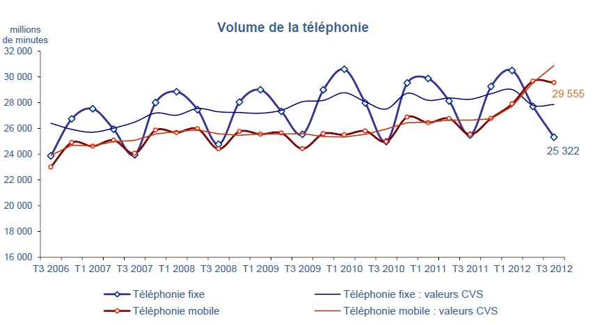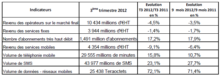 "L’arrivée en janvier 2012 d’un quatrième opérateur de réseaux mobiles, positionné uniquement sur le segment des forfaits, a contribué à accélérer la croissance sur ce marché au détriment de celui des cartes prépayées. Il a également participé au développement des offres forfaitaires libres d’engagement (pratiquement un abonné sur trois en septembre 2012), à la hausse des volumes et à la baisse des prix des services mobiles."