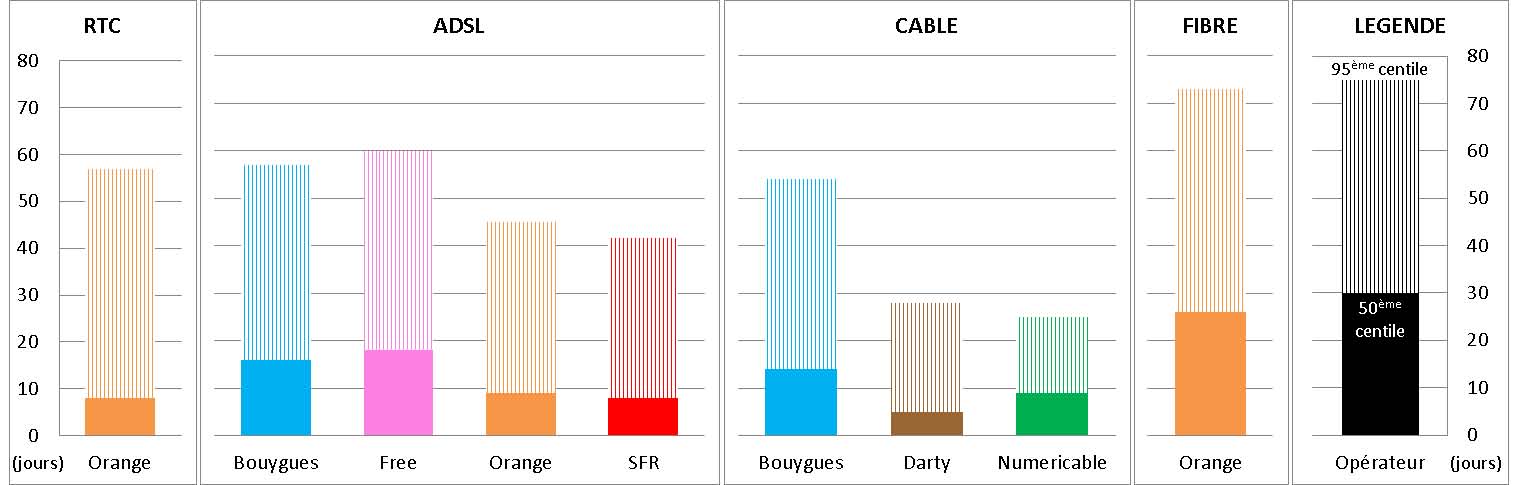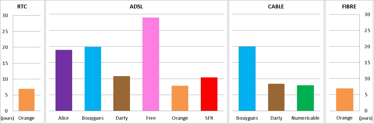 Concernant les mises en services nécessitant la création d’une ligne ou une intervention d’un technicien, Free est le plus mal classé avec un délai d’intervention de 18 à 60 jours pour 50 % à 95 % des nouveaux clients. Il se situe dernier loin derrière Darty ( 5 à 28 jours) ou Orange France Télécom ADSL (11 à 45 jours). Seule la fibre d’Orange présente des délais d’intervention plus long (26 à 73 jours).