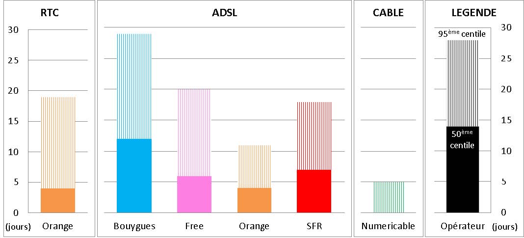Concernant le taux de panne dans les 30 premiers jours, si on différencie les services ADSL Free présente avec Alice ADSL, le taux de panne le plus faible du marché. Ces derniers présentent un taux inférieur à 12 % quand ses concurrents SFR et Orange dépasse celle des 15 %.