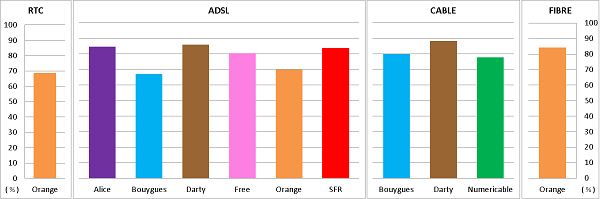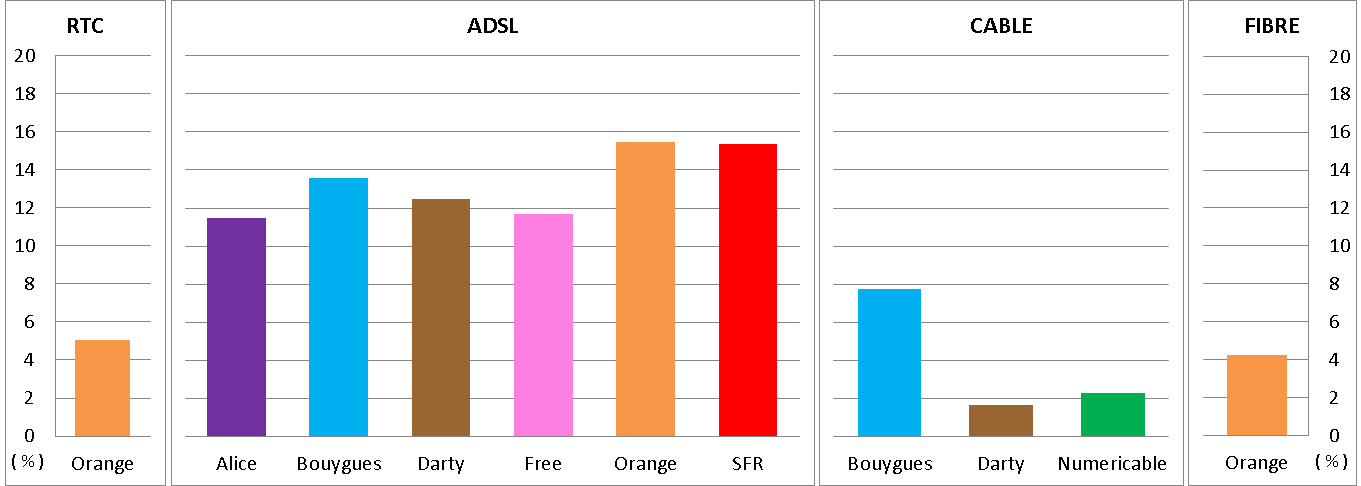 Le réseau cablé présente un taux de panne inférieur à 8 % pour Bouygues Fibre et avoisinant les 2 % pour Darty et Numéricable.