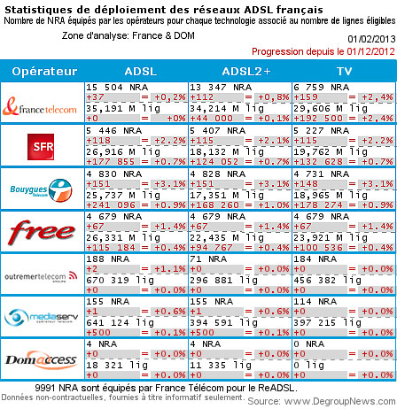 Comme chaque mois, nos confrères de Degroupnews publient le bilan du déploiement des réseaux ADSL. Cette fois-ci, ce sont les résultats de décembre et janvier qui sont publiés ensemble. Sur ces deux mois cumulés, Free a relié 67 nouveaux NRA à son réseau. Un chiffre moyen pour l’opérateur, qui fait moins bien que SFR, qui a dégroupé 118 nouveaux NRA et Bouygues Télécom avec 151 nouveaux NRA raccordés.