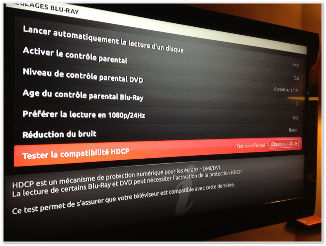 En effet un écran de message d'erreur s'affiche et je ne peut que retourner au menu. Le message dit à peut près ceci:"votre équipement HDMI n'est pas compatible avec le système de protection HDCP de la vidéo..."