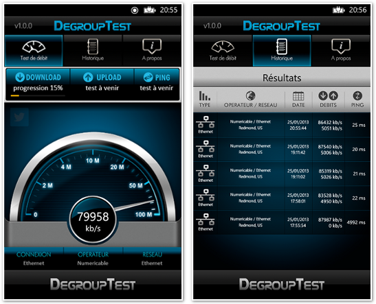 Speedtest est optimisé chez Free mobile (les requetes sont priorisées) mais n'existe pas sur windows phone. Degrouptest semble avoir des problèmes sur certains réseaux DC-HSPA SFR par exemple, et sur certains Androphones (l'appli plante).