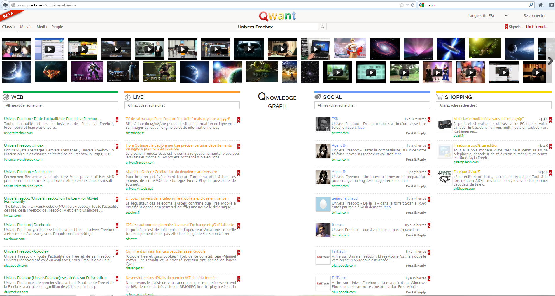 A chaque mot-clé tapé, le moteur vous proposera des liens de recherche, les dernières actualités , des vidéos, les dernières publications des réseaux sociaux ou de boutiques en ligne. Nous l’avons essayé pour vous en recherchant "Univers Freebox". Les résultats sont intéressants : Nous retrouvons des liens des pages principales du site en "web", les derniers articles écrits en "live", les derniers "tweets" et "retweets" de nos articles.