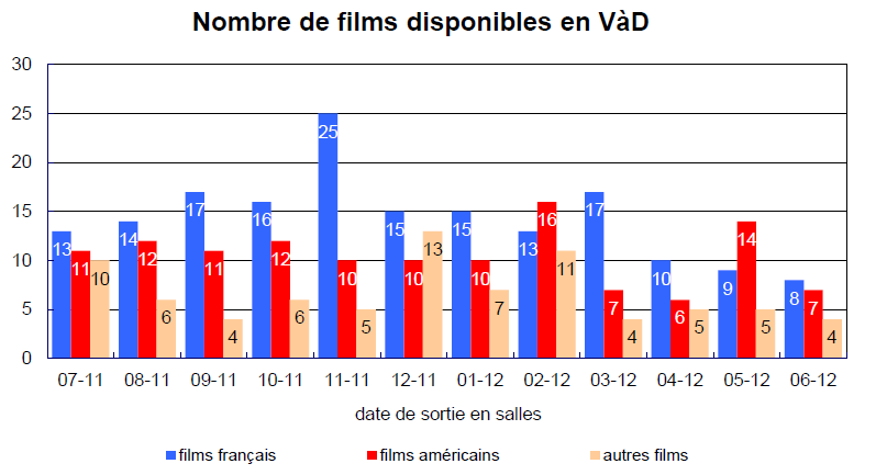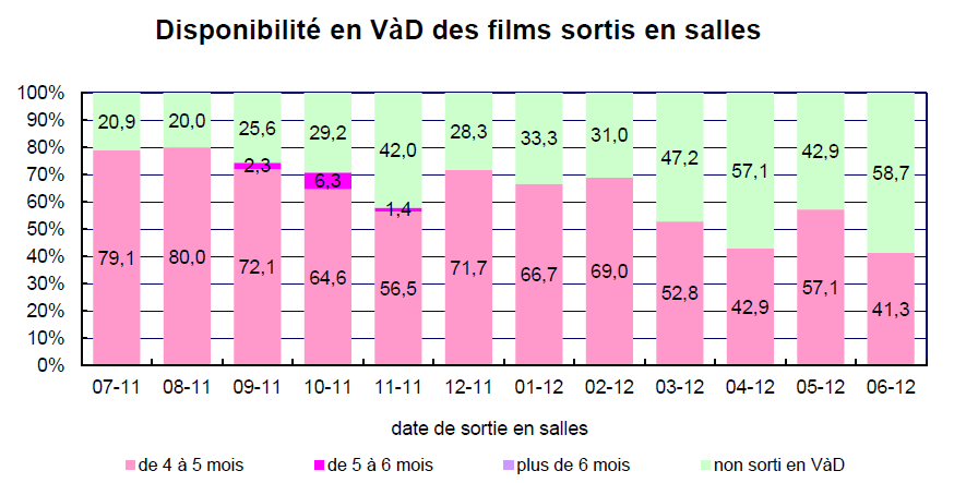 Entre le 1er juillet 2011 et le 30 juin 2012, 378 films sont devenus disponibles en VOD moins de 6 mois après leur sortie en salles soit 63.1% des films sortis en salles. Une tendance qui ne s’améliore pas, seuls 41.3% des films sortis au mois de juin étaient disponibles 5 mois après.