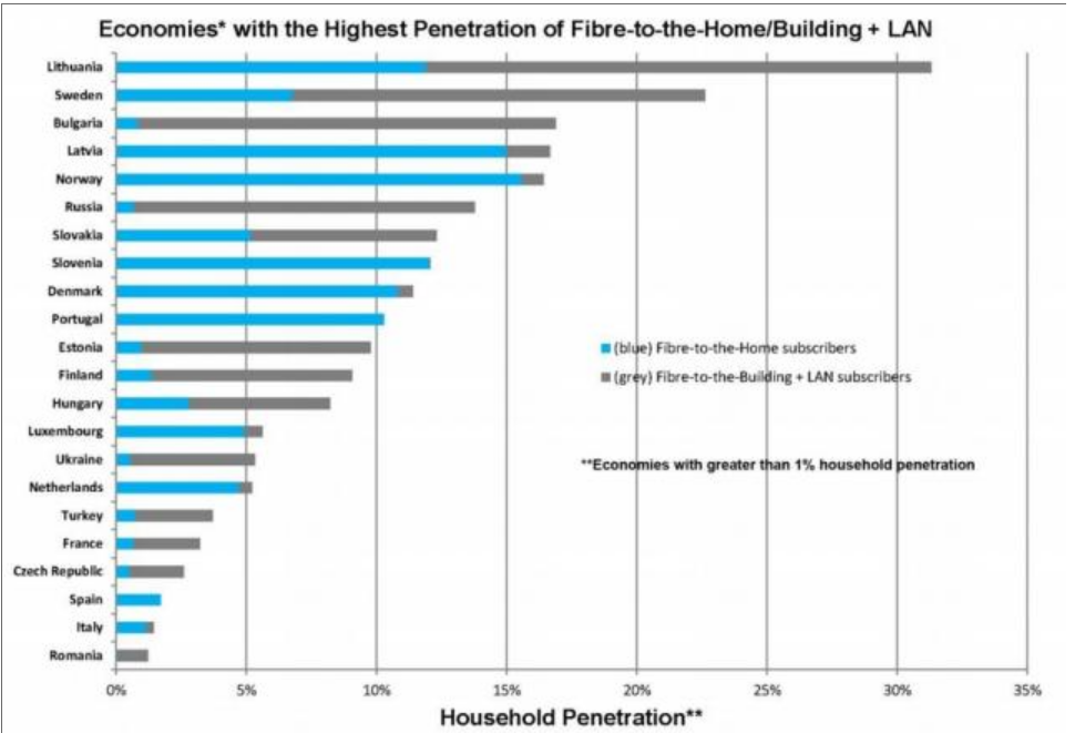 Les pays nordiques Lituanie, Suède, Lettonie et la Norvège dominent le classement avec la Bulgarie dépassant les 15 % de pénétration FTTB. La Lituanie dispose de 30 % de la population en FTTB, Norvège et Lettonie dépassent les 15% de couverture FTTH.