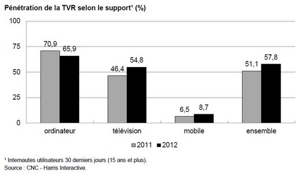 La télévision de rattrapage poursuit sa progression. Le Centre National du Cinéma vient de publier le bilan 2012 de la consommation de TVR.