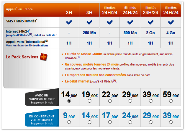 La nouvelle gamme de « forfaits + » est proposée à partir de 14,90 euros par mois et jusqu’à 59,90 euros par mois selon le forfait sélectionné. L’offre d’entrée de gamme inclut 3h d’appels vers les fixes et les mobiles en France, 1 heure d’appels vers les fixes de 69 destinations internationales, les SMS/MMS illimités, pas d’internet. L’offre la plus coûteuse est accessible à partir de 59,90 euros par mois et propose quant à elle, les appels illimités vers les fixes et les mobiles en France, 1 heure d’appels vers les fixes de 69 destinations internationales, les SMS/MMS illimités et 4Go de DATA en H+ (débit réduit au delà). Les offres sont toutes soumises à un engagement de 24 mois, mais existent également avec un engagement de 12 mois (avec ou sans mobile).