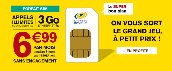 La Poste Mobile lance une nouvelle offre promotionnelle sur le Forfait SIM 24h/24 3Go. Jusqu’au 31 janvier 2016, l’opérateur propose les appels illimités vers les fixes et les mobiles, les SMS/MMS illimités et 3 Go Mo de data pour 6.99 euros par mois pendant 6 mois (au lieu de 18.99 euros par mois).