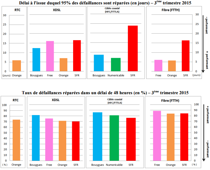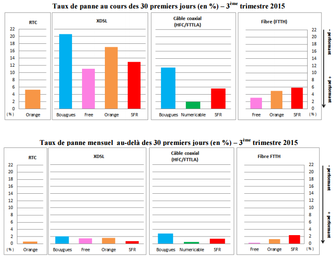 Au total ce sont neuf indicateurs concernant l’accès au réseau des opérateurs et la qualité du service téléphonique qui sont mesurés chaque trimestre. Bouygues Telecom, Free, SFR-Numericable et Orange ont ainsi rendu publics les résultats des mesures effectuées au 3e trimestre 2015 concernant les taux de panne au cours de 30 premiers jours, au delà des 30 premiers jours et le délai à l’issue duquel les défaillances sont réparées. On remarque que les pannes xDSL (et FTTH) sont moins nombreuses chez Free.