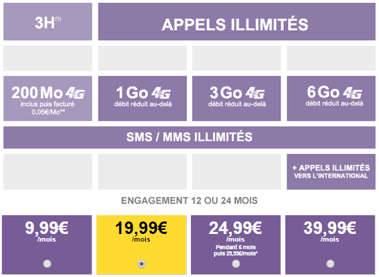 Forfait 3 Go (contre 2 Go auparavant) : appels/SMS/MMS illimités + 3 Go à 24.99€/mois pendant 6 mois puis 29,99€/mois.