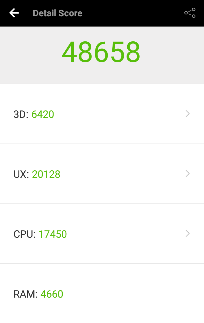 Ci-dessous les résultats AnTuTu (application qui teste les performances du téléphone) : les résultats le place au dessus des smartphone de sa gamme de prix.
