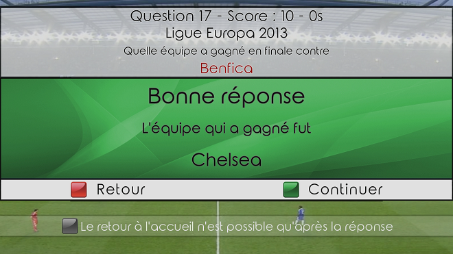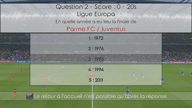 En cette période d’Euro, vous pourrez tester vos connaissances sur le football. Après avoir renommé et choisi votre compte la partie commencera. Vous aurez 20 secondes pour répondre à chacune des questions qui vous seront posées. Pour chaque question, vous aurez le choix parmi 5 réponses. Les questions s’enchaîneront ensuite en continu.