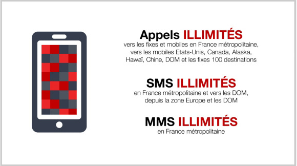 - Appels illimités en France métropolitaine, vers les mobiles Etats-Unis, Canada, Alaska, Hawaï, Chine, DOM