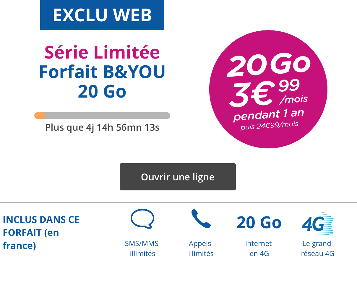 Hier soir, Free Mobile lançait une Vente Privée inédite : le forfait illimité 50 Go à 0€ pendant 6 mois. Bouygues Télécom n’a pas tardé à répliquer puisque depuis hier soir, il propose une édition spéciale sur son site internet : le forfait B&You 20 Go à 3,99€ par mois pendant un an puis qui repasse à 24,99€ après la promotion.