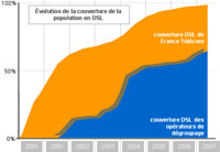 A travers plusieurs graphiques, l’ARCEP nous explique que le dégroupage a poussé France Télécom à étendre sa couverture ADSL sur la totalité de ses répartiteurs et cela en quelques années. Cette poussée fait maintenant de la France l’un des premiers pays européen en terme de couverture haut débit.