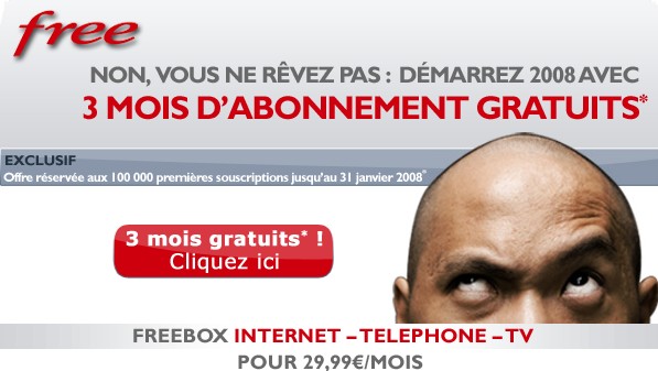 3- Vous inscrire impérativement via le bouton prévu à cet effet, "3 mois gratuits* Cliquez ici" d’ici le 31/01/2008 à minuit et donc avoir reçu le mail en question. Toute inscription faite par un autre mode de souscription ou en dehors du délai ci-dessus défini ne vous permettra pas de bénéficier de l’offre "3 mois gratuits".