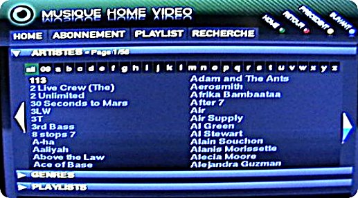 La catégorie Musique révolutionne ce qui se faisait jusqu’à présent. Il est en effet possible d’accéder à des milliers de clips, classés par artistes ou par genres. Et l’éclectisme est de mise puisque l’on retrouve aussi bien des artistes français qu’étrangers (les artistes anglophones se taillant cependant la part du lion) et dans quasiment tous les genres. Pour autant, tous les titres de chaque artiste ne sont pas disponibles (les plus connus en général). Une catégorie HD propose également différents concerts de Beyonce à Phil Collins.