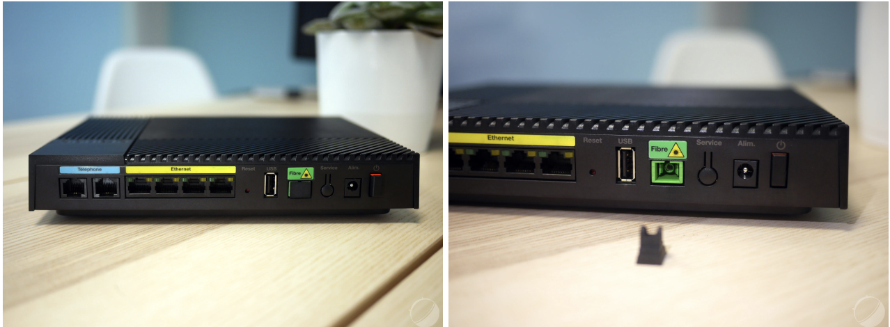 A l’arrière, figurent 4 ports Ethernet, deux prises téléphoniques, l’alimentation ON/OFF, une prise de service et une entrée fibre. Celle-ci, "accueille directement un câble de fibre optique, sans adaptateur ni boitier intermédiaire. L’absence d’intermédiaire peut en théorie permettre de profiter pleinement de la fibre, et pourquoi pas laisser espérer une connexion à 10 Gbps", commente nos confrères.