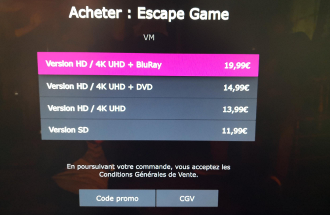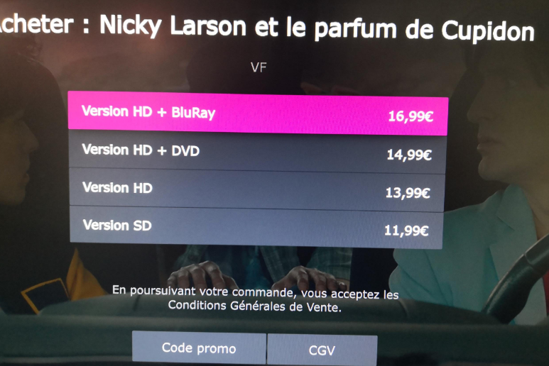 Coté tarif, tout est inclus, c’est à dire que le prix de la livraison est intégré dans le prix de l’offre qui est affiché sur l’interface TV. Et pour bénéficier du support physique lors d’un achat digital, le tarif est à peine plus élevé, environ 1 euro de plus pour le DVD et 3€ à 6€ de plus pour le Blu-ray