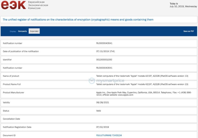 En effet, le site MySmartPrice rapporte qu’Apple aurait fait une demande d’homologation à l’Eurasion Economic Commission en Russie pour 5 nouveaux modèles d’iPad. Ces nouveaux modèles portent les noms de code A2068, A2198, A2230, A2197, et A222 et fonctionneront avec iOS 13. Cette version de l’OS n’est pas encore disponible pour tout le monde, mais elle devrait l’être d’ici septembre. Ces nouveaux iPad pourraient être présentés d’ici la rentrée.