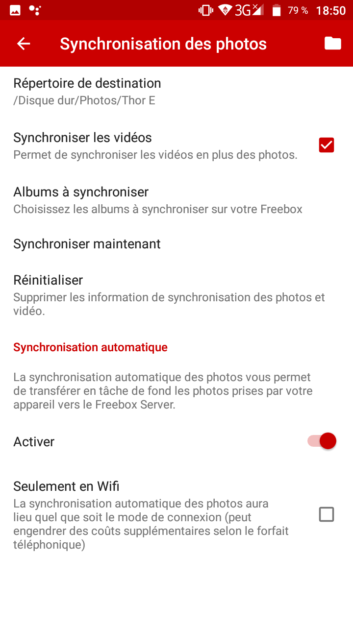 Ensuite, il vous faudra activer la synchronisation automatique. Une fois cela fait, vous pourrez choisir d’effectuer cette synchronisation uniquement en Wifi (option cochée par défaut) ou bien de l’effectuer en Wifi + 3G/4G (auquel cas il vous faudra décocher la case Wifi uniquement, mais faites attention à votre fair use si vous n’êtes pas en data illimitée). Vous pouvez également choisir de synchroniser les vidéos.