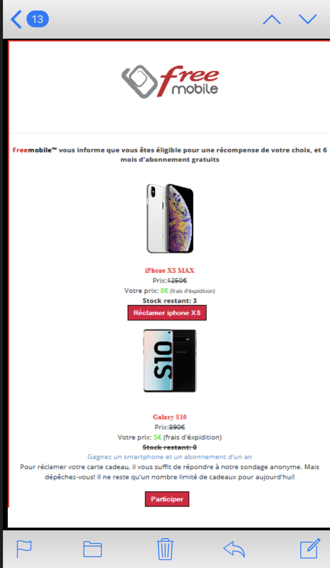 Ce nouveau phishing se démarque en reprenant l’identité visuelle utilisée par l’opérateur avant son lancement, du 28 octobre 2009 au 19 septembre 2011 tout en faisant croire à ses proies qu’elles ont remporté un cadeau, soit un iPhone XS Max en leur tarifant soit disant 8€ de frais d’expédition ou un Samsung Galaxy S10 mais aussi six mois d’abonnement offert à un forfait mobile Free. Pour récupérer sa récompense, il faut alors répondre à un douteux sondage anonyme. Bien entendu ne cliquez pas sur le lien, la tactique ne change pas, l’objectif est de dérober votre numéros de carte bancaire. Pour couronner le tout, Pour couronner le tout, l’adresse mail de l’expéditeur, incompréhensible, n’est pas celle utilisée par l’opérateur, à savoir Freemobile@free-mobile.fr.