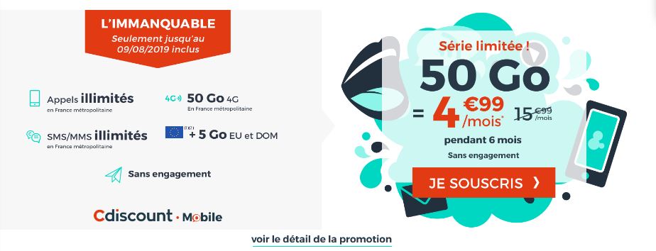 Jusqu’au 9 août inclus, Cdiscount Mobile propose un forfait mobile à 4,99 euros par mois, au lieu de 15.99 euros pendant les six premiers mois. Le forfait tel qu’il était proposé auparavant proposait un tarif de 4.99€/mois pendant six mois puis 15€/mois. L’immanquable de Cdiscount comprend les appels, SMS et MMS en illimité, ainsi que 50 Go de data en 3G/4G pour la France Métropolitaine et 5 Go en 3G pour le reste de l’Union européenne.
