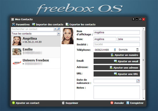 La Freebox Révolution permet dorénavant de gérer des contacts, via Freebox OS. Cela va permettre d’afficher les noms et prénoms de vos contacts sur l’afficheur de la Freebox, sur le journal d’appel (via Freebox OS ou via Freebox Compagnon) mais également directement sur l’afficheur de votre téléphone, connecté par fil ou en DECT.