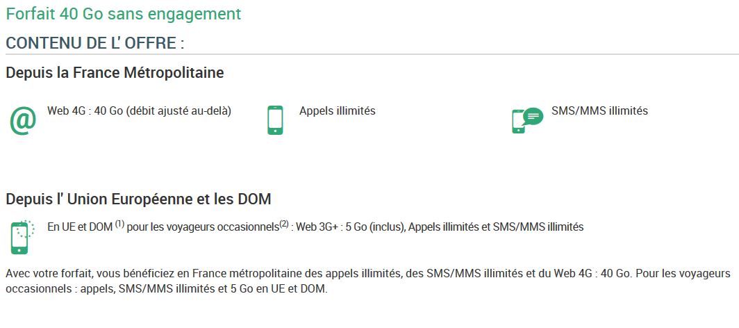 Ce forfait mobile inclut les appels, SMS et MMS en illimité, ainsi que 30 Go de data utilisables en France Métropolitaine avec des débits 3G ou 4G selon la couverture disponible. Pour l’international 5 Go en 3G+ depuis l’Union Européenne et les DOM sont inclus ainsi que les appels, SMS/MMS illimités.