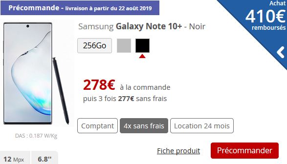 Il est proposé en deux coloris, Argent et Noir. Ce modèle est vendu à 959€ au comptant, mais il est également possible de l’acheter en 4 fois sans Frais pour 242€ à la commande puis trois fois 239€ sans frais. Pour ceux qui le souhaitent, il est également possible de le louer pendant 24 mois pour 24€ par mois, avec un premier paiement de 179€ à la commande. Du 7 août (à partir de 22h) au 22 août 2019, pour la précommande de ce smartphone (tous modèles, tous coloris) et la reprise de votre ancien smartphone par notre partenaire (tous modèles, toutes marques et tous états), Samsung propose entre 100€ et 410€ de remboursement.