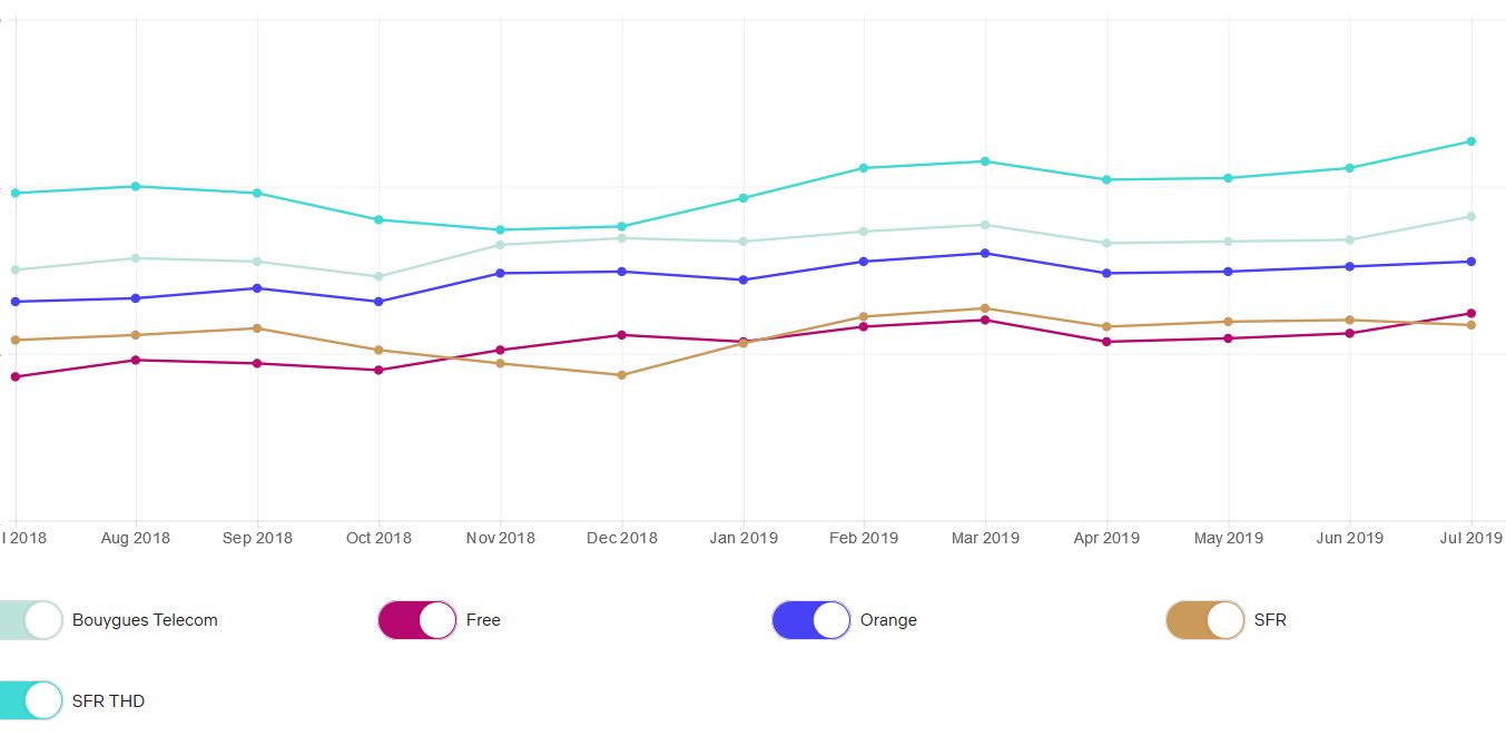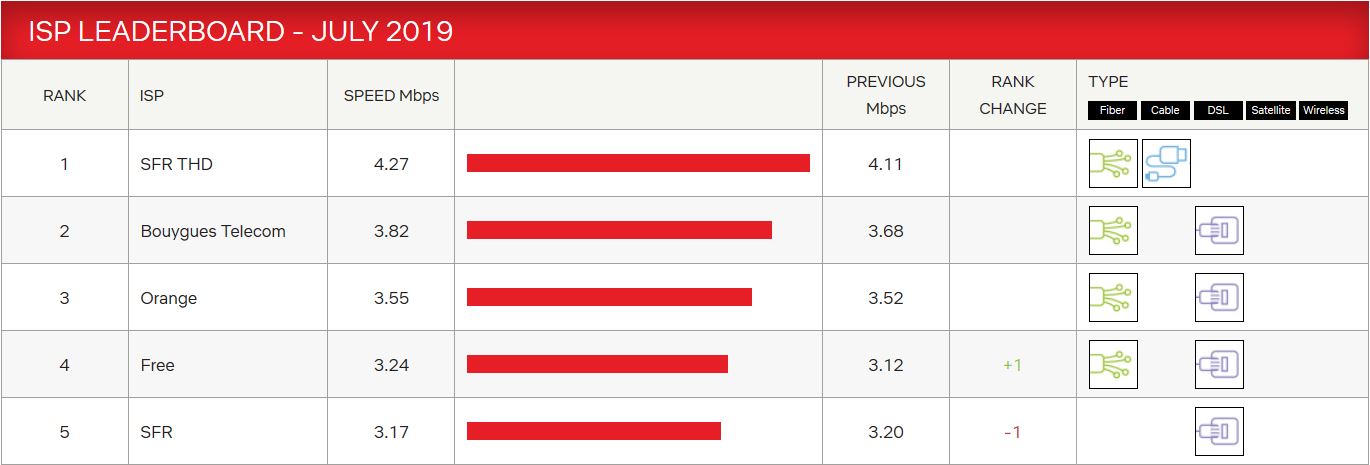 Concrètement, au cours du mois de juillet SFR "câble et FTTH" conserve sa place de numéro un avec un débit moyen de 4.27 Mbits/s en augmentation par rapport au mois dernier (4.11 Mbits/s). En deuxième position, Bouygues Télécom, affiche 3,82 Mbits/s contre 3,68 Mbits/s le mois précédent. A la 3ème place on trouve Orange avec 3,55 Mbits/s, en augmentation par rapport à juin. Et donc la grosse surprise, Free se place en 4ème position, avec 3,24 Mbits/s (contre 3.12 Mbits/s le mois d’avant) et donc "SFR ADSL" qui se retrouve donc à la 5ème place avec 3.17 Mbits/s contre 3.20 Mbits/s le mois dernier. Ce changement dans le classement n’était pas arrivé depuis le mois de janvier 2019.