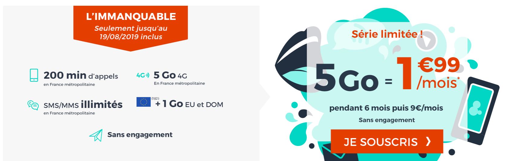 Le forfait inclut les SMS et MMS en illimité 200 minutes d’appels, ainsi qu’une enveloppe de 5 Go à utiliser en France avec des débits 3G/4G (selon la couverture disponible). Pour les autres pays de l’Union européenne et les DOM, il propose une enveloppe supplémentaire de 1 Go et des débits 3G/3G+. A noter d’ailleurs que vous bénéficiez des mêmes conditions au niveau des SMS/MMS et appels à l’étranger (Union Européenne + Islande, Liechenstein+ Norvège et 8 territoires d’Outre-Mer).