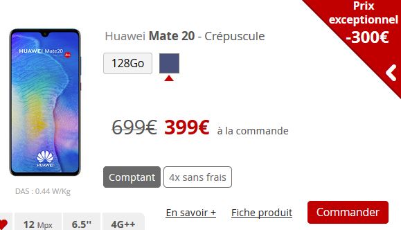 Pour sa version standard, le Mate 20 passe de 699€ à 399€ au comptant. Pour le paiement en 4 fois, il vous faudra payer 102€ à la commande puis 99€ pendant trois mois.