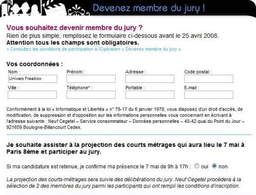Pour devenir membre du jury Un regard Neuf, il faut bien entendu être abonné chez Neuf Cegetel. Mercredi 7 mai, le jury se réunira à Paris pour visionner tous ces courts-métrages et choisir celui qui remportera le prix "Un regard Neuf".