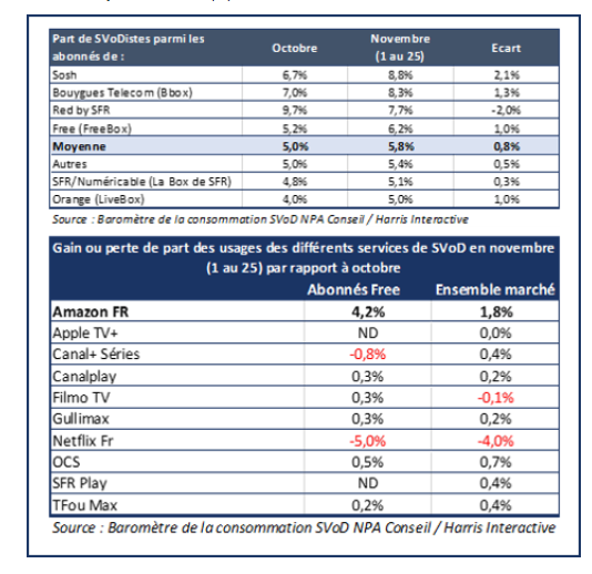 Autres effets positifs, "le double impact (élargissement du parc d’abonnés initialisés et meilleur confort d’accès au service, via l’interface Free) ne s’est pas fait attendre : en novembre (du 1er au 25), Amazon a représenté près de 10% de la consommation de SVoD des clients de l’opérateur", révèle également Philippe Bailly. Le duo Amazon-Free fonctionne à merveille , puisque selon le baromètre les abonnés Free "pèsent désormais pour presque 30% de la consommation d’Amazon Prime Video (+8,6 points par rapport à octobre)."