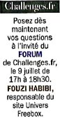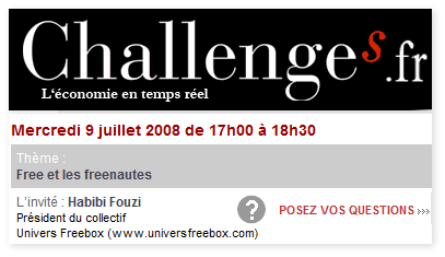 Univers Freebox sera l’invité du magazine Challenges, le Mercredi 09 juillet prochain, en direct entre 17h00 et 18h30 afin de débattre autour d’un thème précis : Free et les Freenautes !L’explosion de 1er opérateur Alternatif, Free, a vu naître des communautés. Univers Freebox compte plus d’1 million de visites par mois. A quoi servent ces communautés de passionnés ? Site d’actualité ? Simple "hotline" gratuite ? Comité de défense des utilisateurs ?